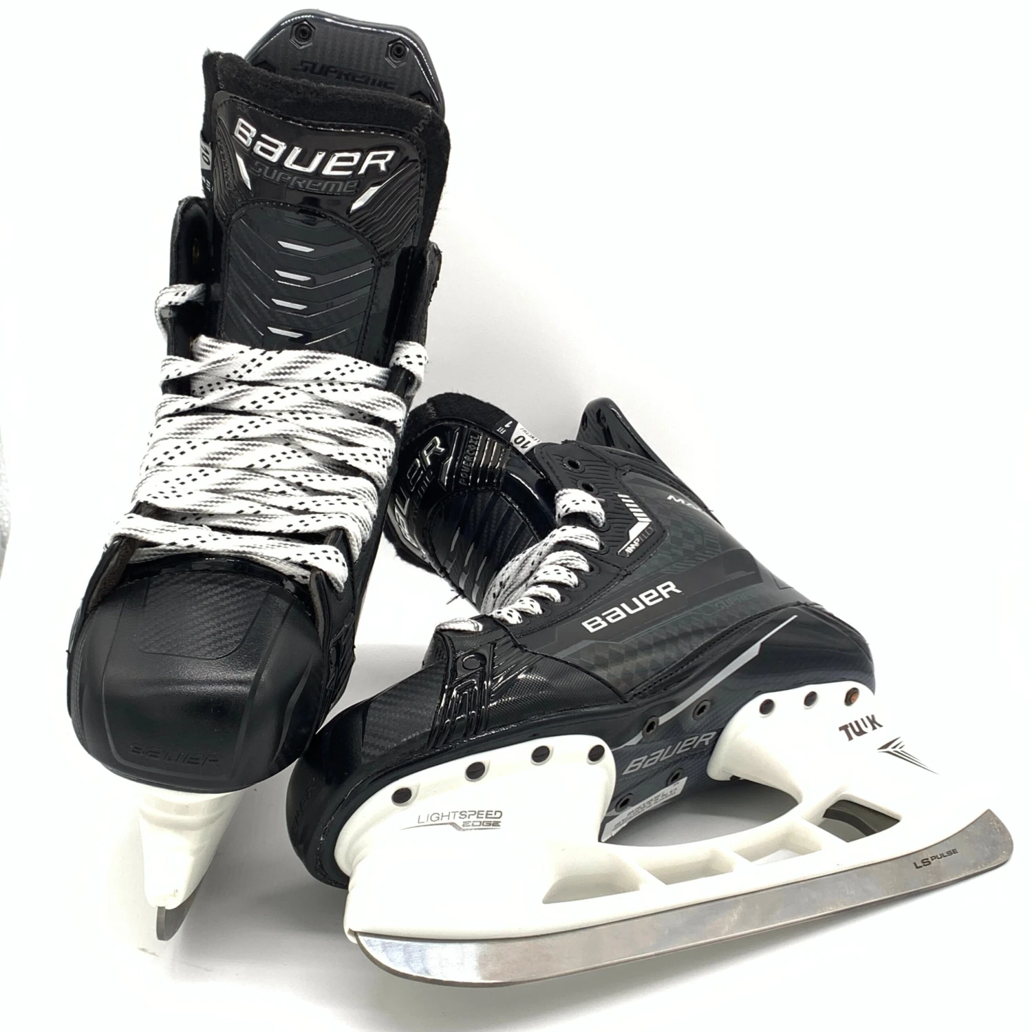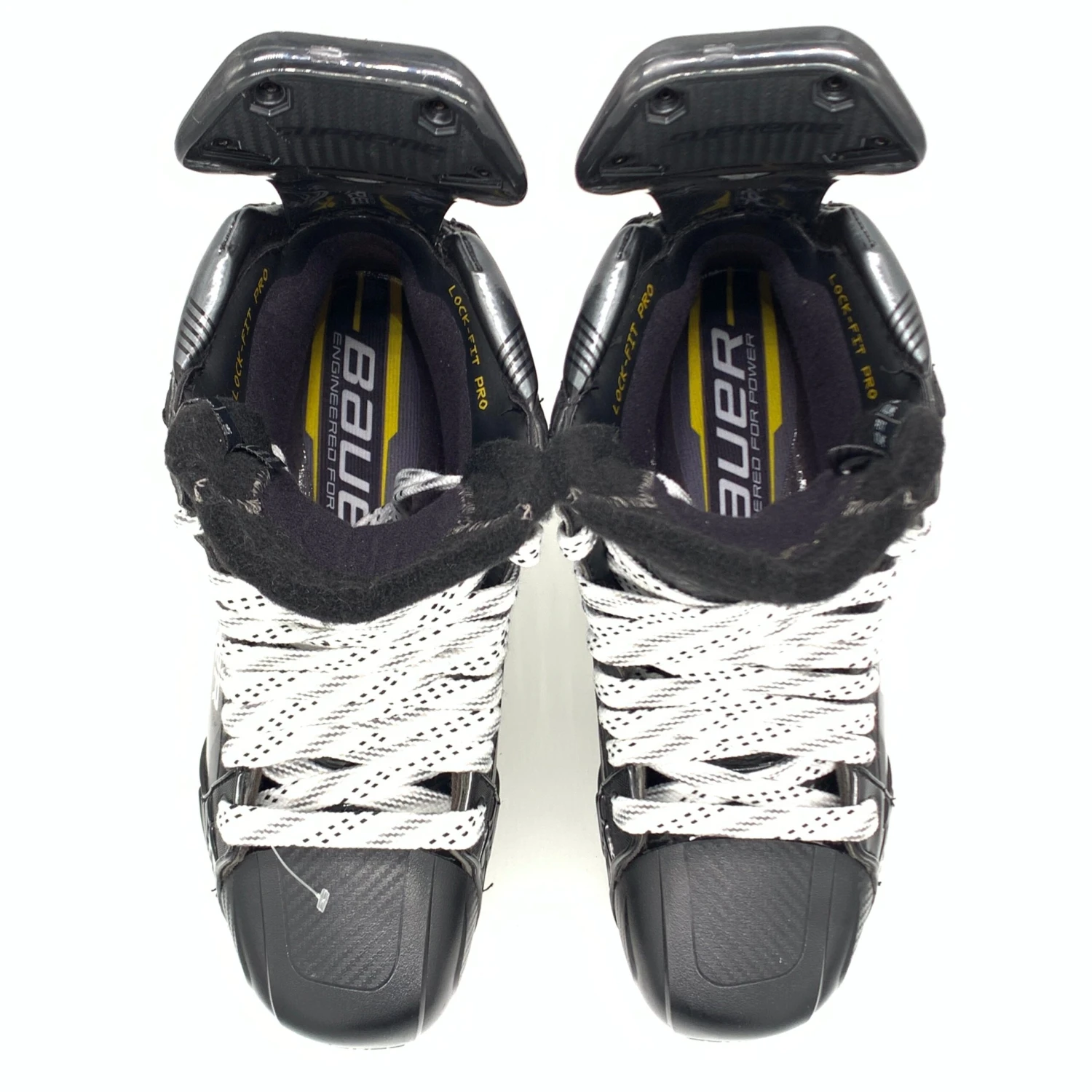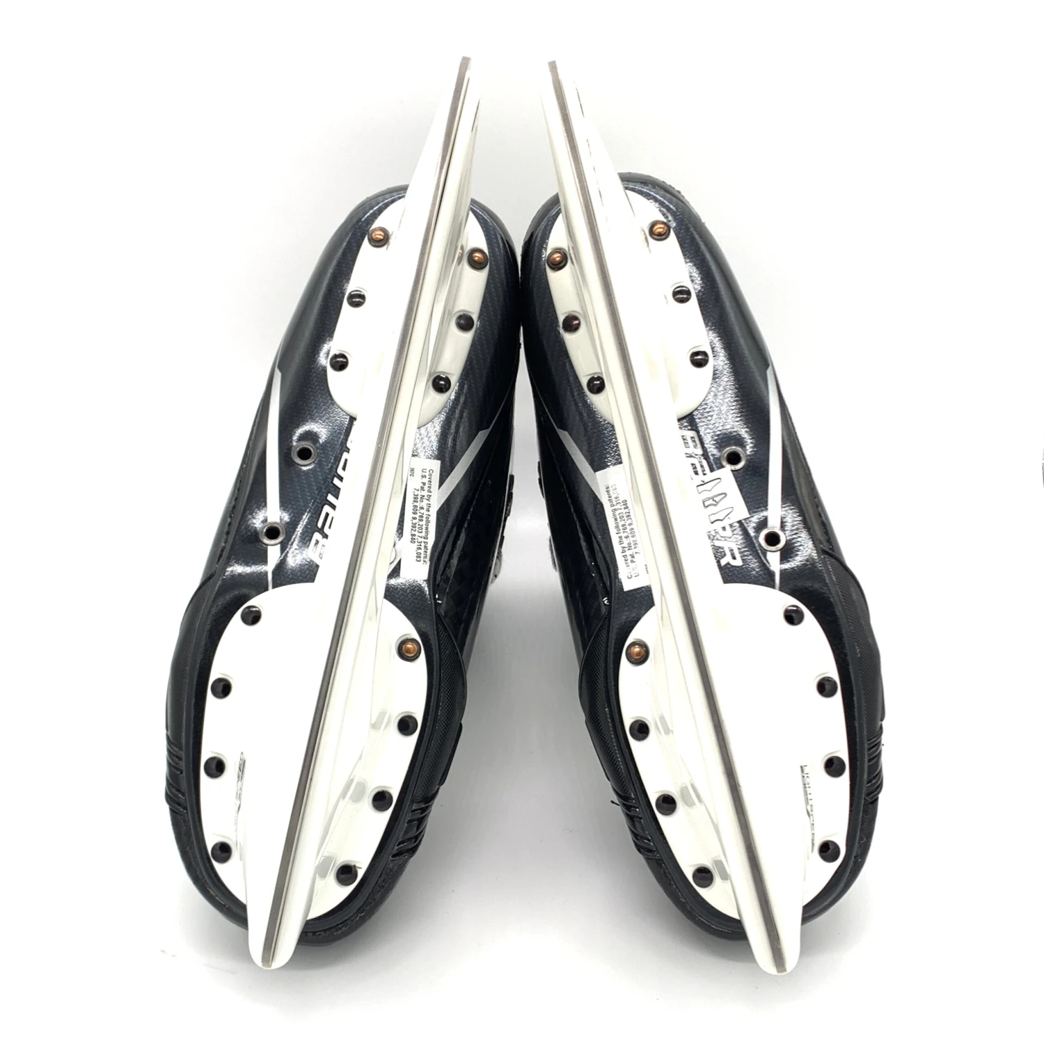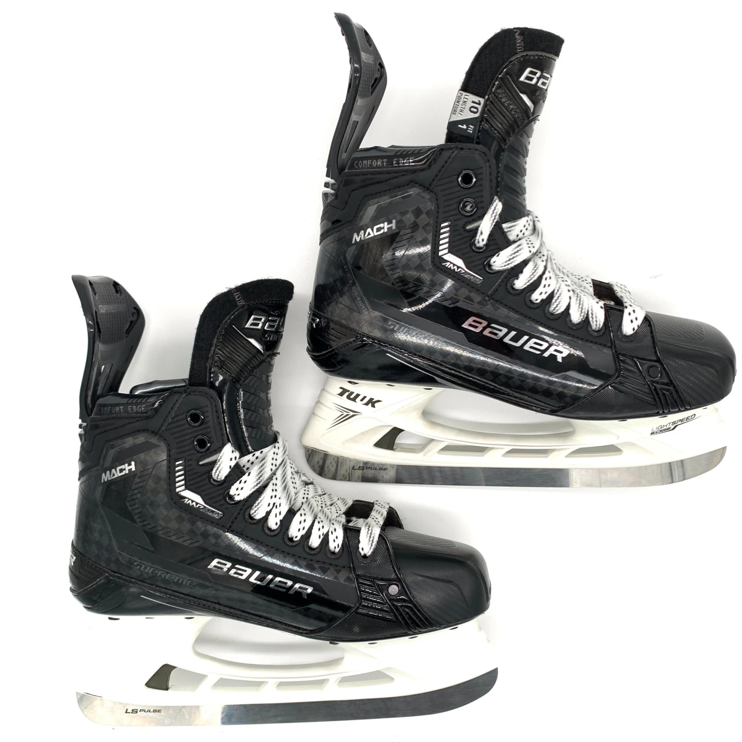 Bauer Supreme Mach skates from an NCAA team. Size 10 Fit 1 with 288 Tuuk holders and LS Pulse steel. These skates appear to be retail but are sourced from a pro teams locker room.