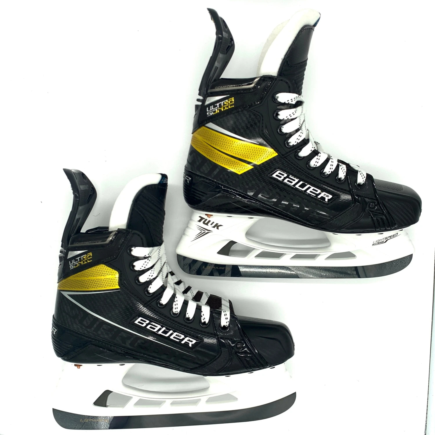 Bauer Supreme Ultrasonic skates from a Pro locker room. Left skate size 8.25C and right skate size 8C with 272 Tuuk Lightspeed Edge holders and LS Pulse TI steel.