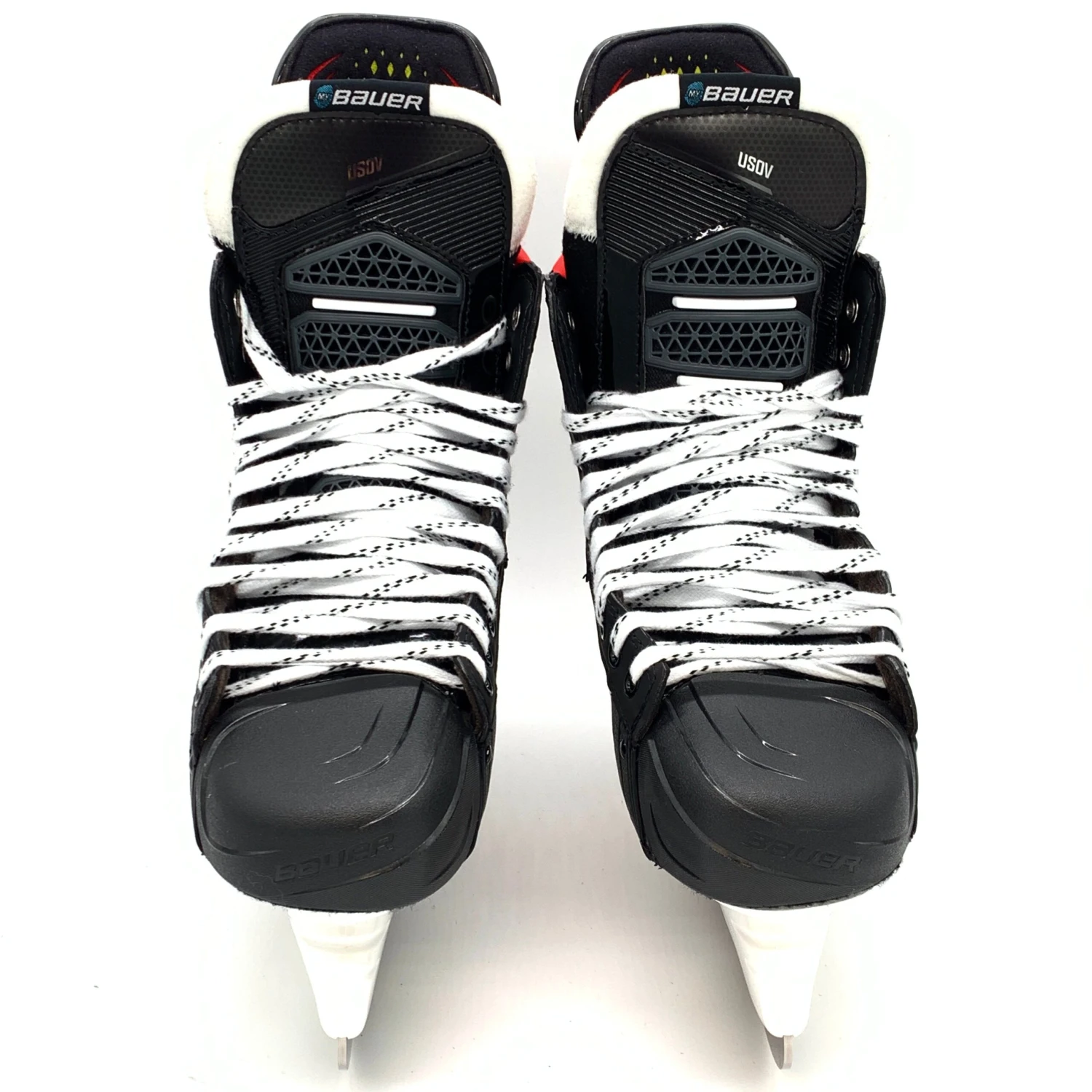 New Pro Stock Bauer Vapor 2X Pro Skates from a CHL team. Left size 11D right size 10.5D with 296 Lightspeed Edge holders and LS Pulse TI Steel. These skates have “USOV” custom printed on the tongue.