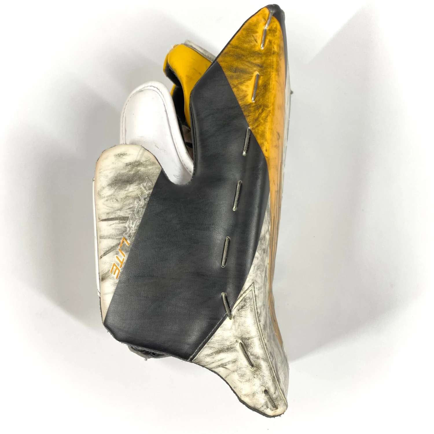 White and yellow used pro stock Bauer Vapor Hyperlite goalie blocker.