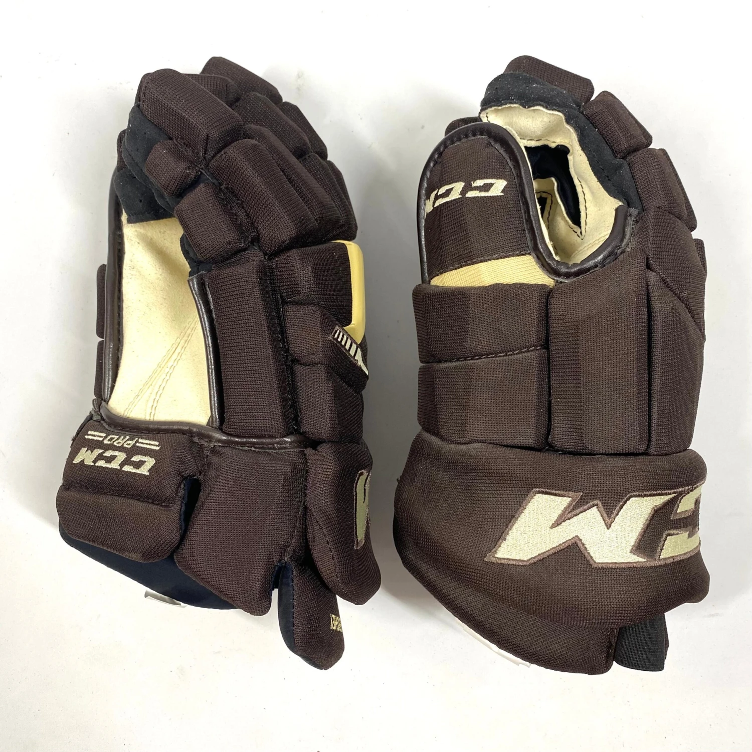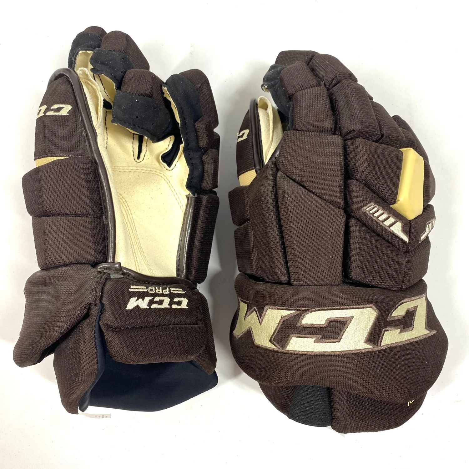 This pair of gloves are a CCM Tacks Pro Stock with extra plate protection.