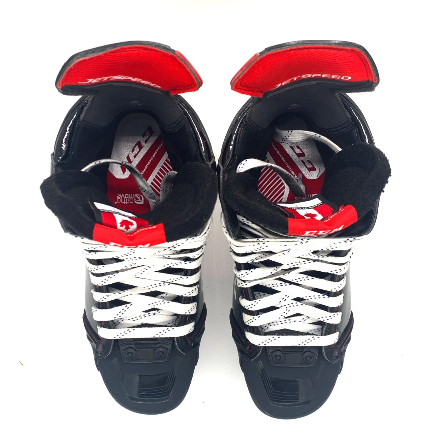 CCM Jetspeed FT4 Pro hockey skates from a Pro locker room. Size 7.75D with 271 XS CCM holders and XS1 Black steel. These skates have a custom “Stefanson 9” printed on the tongues.