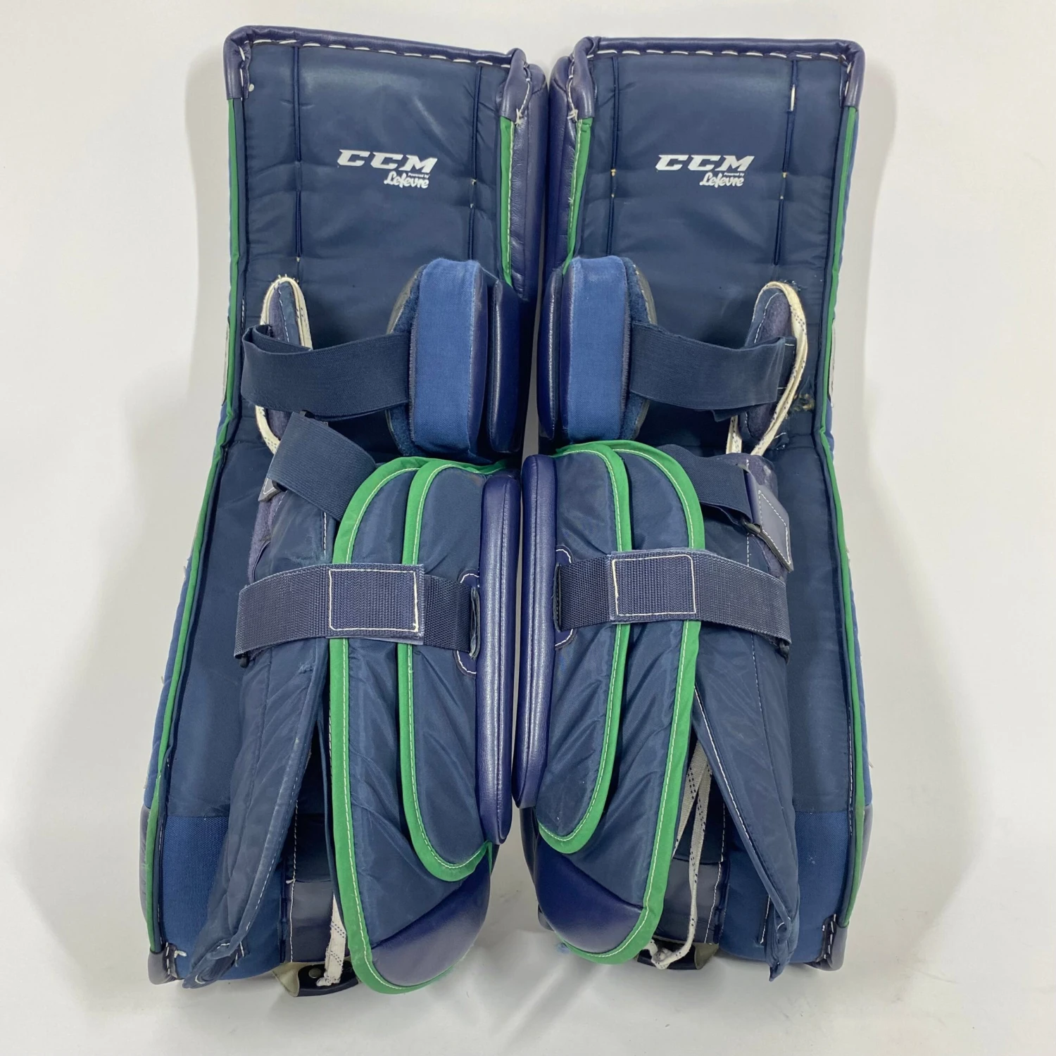 These are a pro stock set of goalie pads from an NCAA team in excellent condition with very little signs of use shown by general wear and some puck marks. There are no rips in the leather and all straps work as intended.