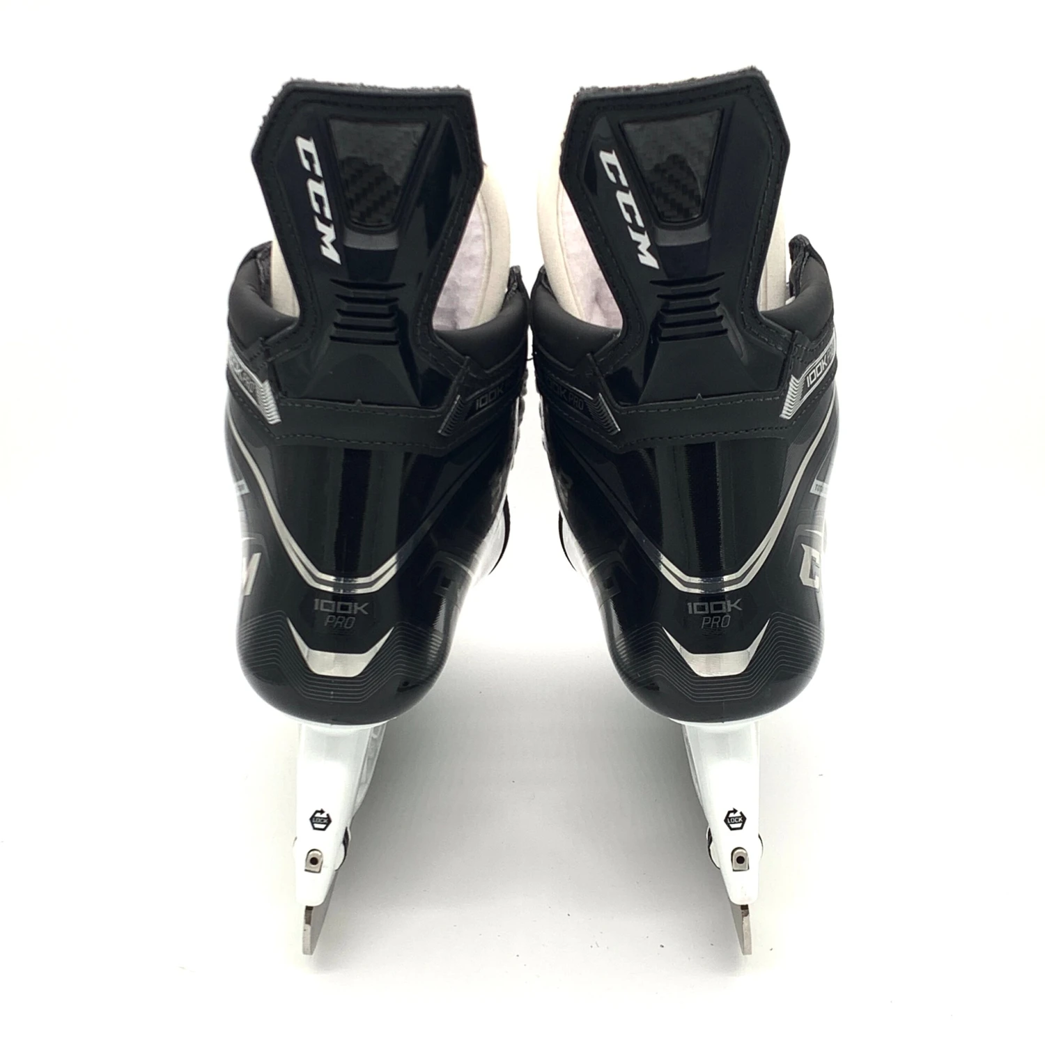 New Pro Stock CCM Ribcor 100K Pro Skates from a Pro locker room. These skates appear to be retail and are size 9.75D with 287 XS holders and XS1 Black steel. These skates have “JAGS” custom printed on the tongue.