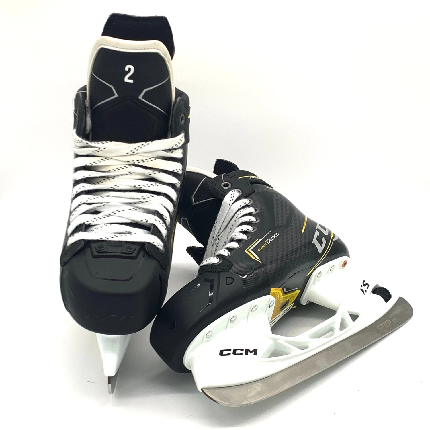 New CCM super tacks AS3 skates from a Pro locker room. Size 9D with 280 XS holders and Step steel. Brand new in box. These skates have ‘2″ custom printed on each tongue.